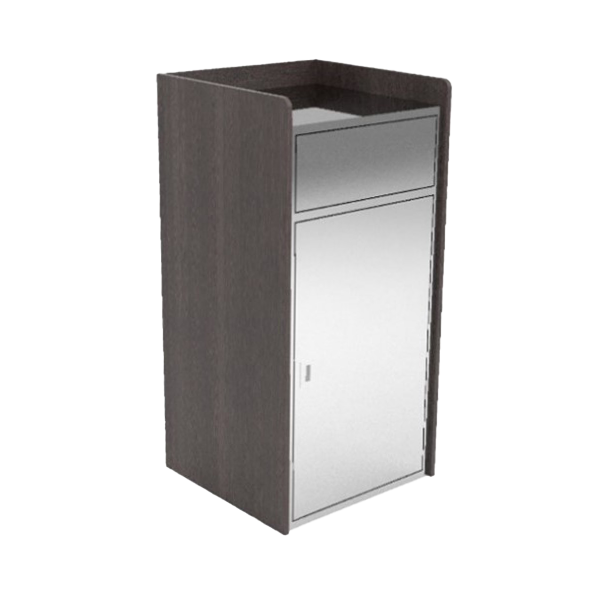 Acero inoxidable pulido con cubierta exterior MDF nogal; balancín superior, compartimento lateral, embudo interno y bote 120 L.
